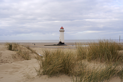 Sand dunes with Talacre lighthouse, North Wales, in the background.