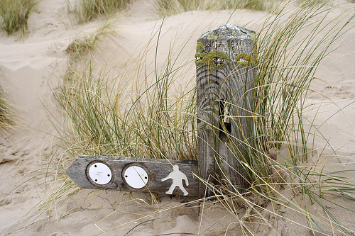A wooden signpost buried in sand.