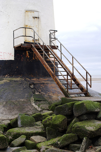 Rusty metal steps leading up to Talacre lighthouse in North Wales.