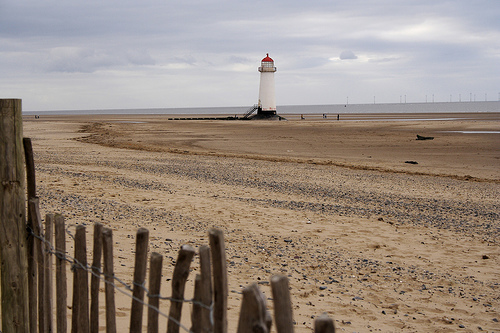 Wooden fencing with Talacre lighthouse, North Wales in the background.