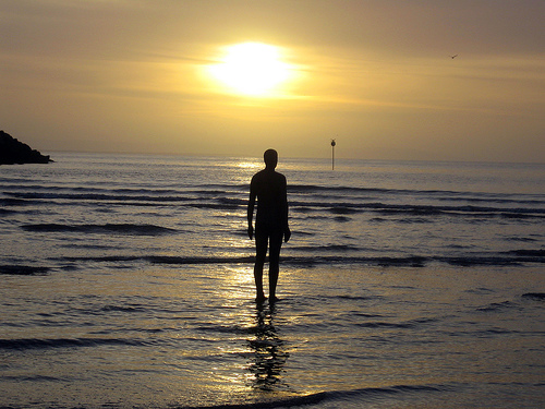 One of 100 cast iron sculptures on Crosby beach (near Liverpool, UK) in the setting sun.